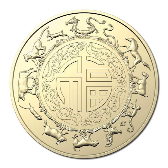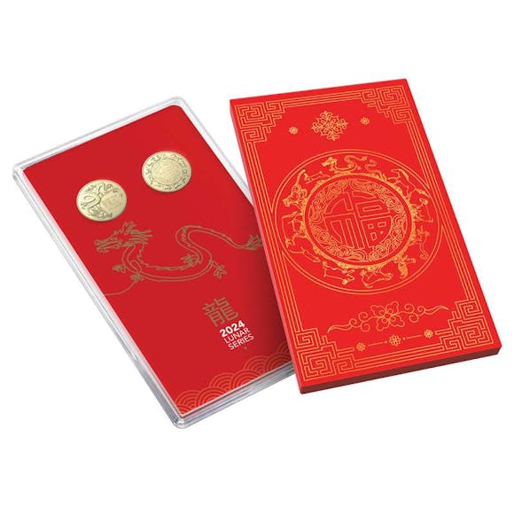 To celebrate the Lunar Year of the Dragon, the Royal Australian Mint has release this 2024 $1 uncirculated two-coin set featuring the confident and noble Dragon and the Lunar calendar wheel.